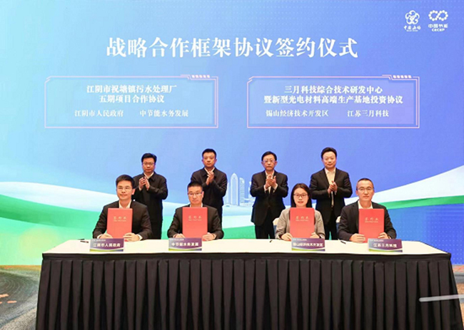 簽約儀式上,中節(jié)能水務(wù)發(fā)展有限公司和江陰市政府簽訂城鎮(zhèn)污水處理合作協(xié)議,江蘇三月科技股份有限公司和錫山區(qū)政府簽訂新型光電材料高端生產(chǎn)基地建設(shè)項(xiàng)目合作協(xié)議,中節(jié)能鐵漢生態(tài)環(huán)境股份有限公司和無(wú)錫市環(huán)保集團(tuán)有限公司簽訂戰(zhàn)略合作框架協(xié)議,中節(jié)能節(jié)能科技東南分公司和中國(guó)移動(dòng)通信集團(tuán)江蘇有限公司無(wú)錫分公司簽訂機(jī)房余熱回收利用項(xiàng)目合作協(xié)議。