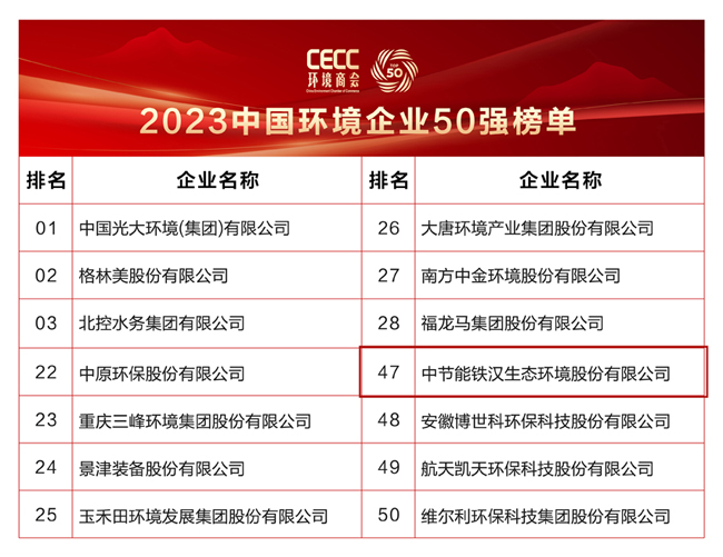 喜報 | 中節能鐵漢連續6年榮登“中國環境企業50強”榜單