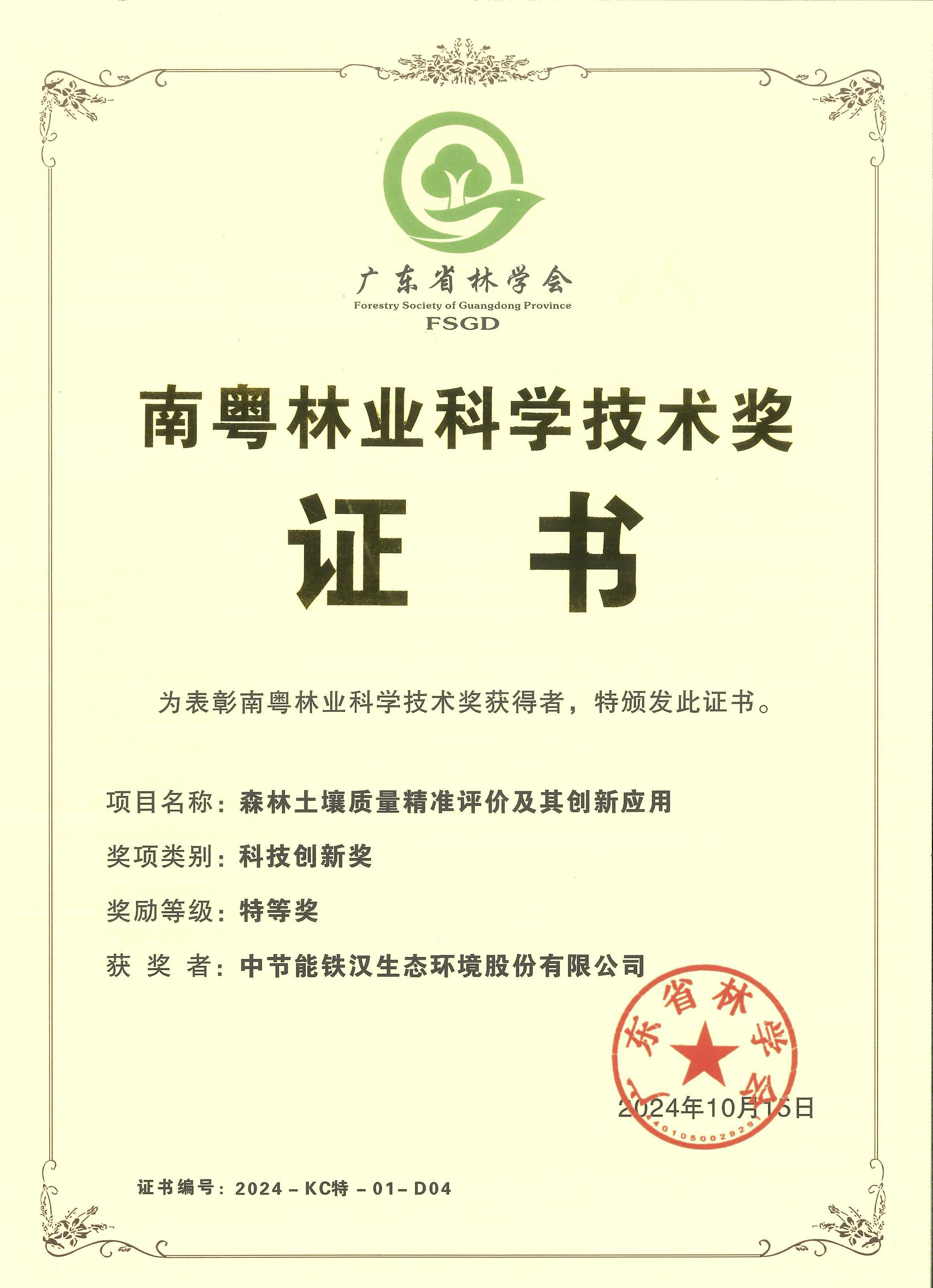 近日,廣東省林學(xué)會(huì)第六屆南粵林業(yè)科學(xué)技術(shù)獎(jiǎng)評(píng)審結(jié)果揭曉,由中節(jié)能鐵漢生態(tài)環(huán)境股份有限公司聯(lián)合廣東省林業(yè)科學(xué)研究院、中山大學(xué)等單位共同申報(bào)的《森林土壤質(zhì)量精準(zhǔn)評(píng)價(jià)利用及生態(tài)修復(fù)》成果再獲殊榮,榮獲該獎(jiǎng)項(xiàng)科技創(chuàng)新類“特等獎(jiǎng)”。該成果早前還榮獲了第十九屆中國(guó)土壤學(xué)會(huì)科學(xué)技術(shù)獎(jiǎng)二等獎(jiǎng)。