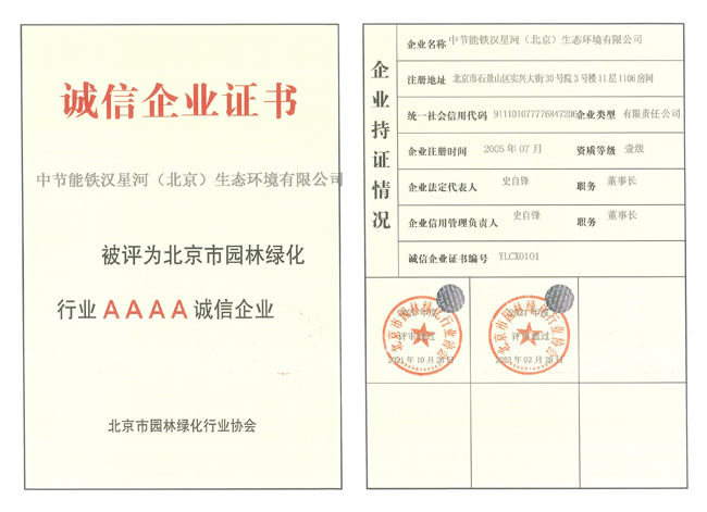 “誠信企業(yè)”是北京市園林綠化行業(yè)為提高園林綠化企業(yè)的綜合素質(zhì)、樹立良好形象,提高在社會活動中的誠信度,增強企業(yè)的守法和信用意識而建立起的重要行業(yè)標(biāo)準(zhǔn)。誠信企業(yè)評定是企業(yè)招投標(biāo)、施工、評優(yōu)的重要參考,也是對鐵漢星河在園林綠化領(lǐng)域經(jīng)營成果與綜合實力的高度認(rèn)可和肯定,彰顯了鐵漢星河誠信精工的企業(yè)形象和品牌影響力。