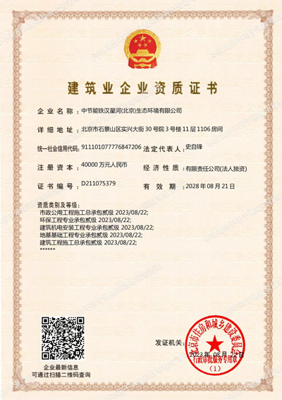 近日,經北京市住建委核準,中節能鐵漢所屬鐵漢星河取得市政公用工程施工總承包貳級、環保工程專業承包貳級、建筑機電安裝工程專業承包貳級、地基基礎工程專業承包貳級、建筑工程施工總承包貳級5項資質。