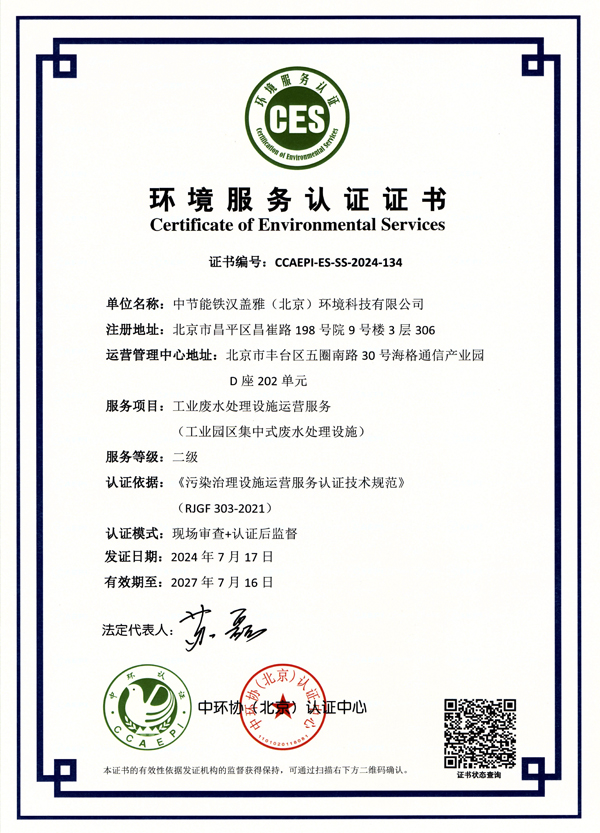 喜報 | 鐵漢蓋雅取得工業(yè)廢水處理設(shè)施運營服務(wù)二級認(rèn)證證書